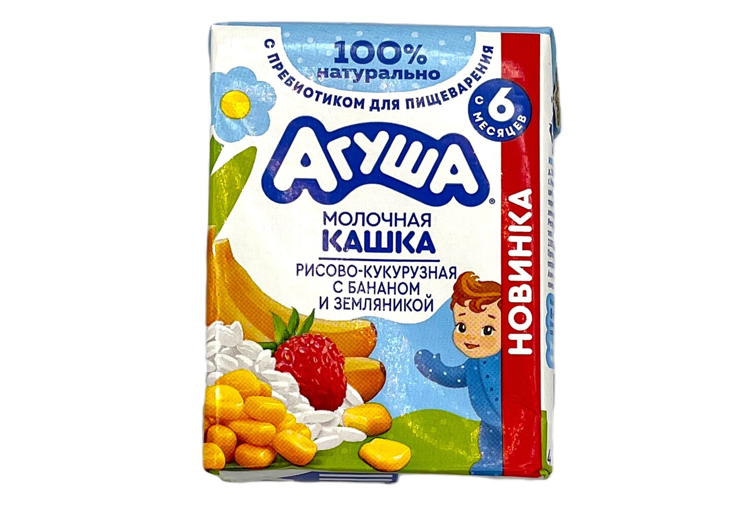 Состав: молоко нормализованное, вода, мука (рисовая, кукурузная), сахар, олигофруктоза, пюре банановое, ароматизаторы натуральные, фруктовый порошок земляничный.