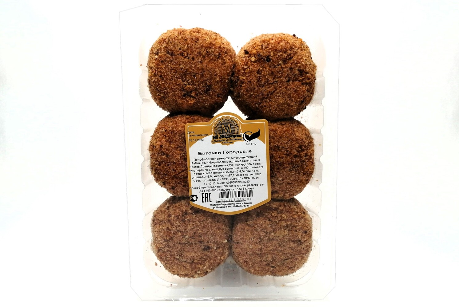 Биточки Городские. Полуфабрикат замороженный мясосодержащий, рубленный, формованный, панировачный категории В. Состав: говядина, свинина, сухари панировачные, соль повареная пищевая, перец черный молотый, лук репчатый.