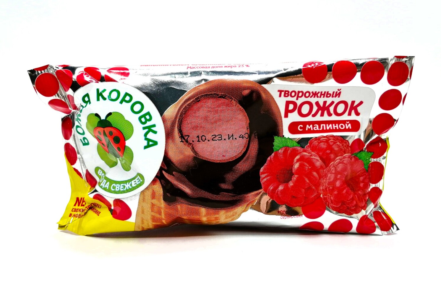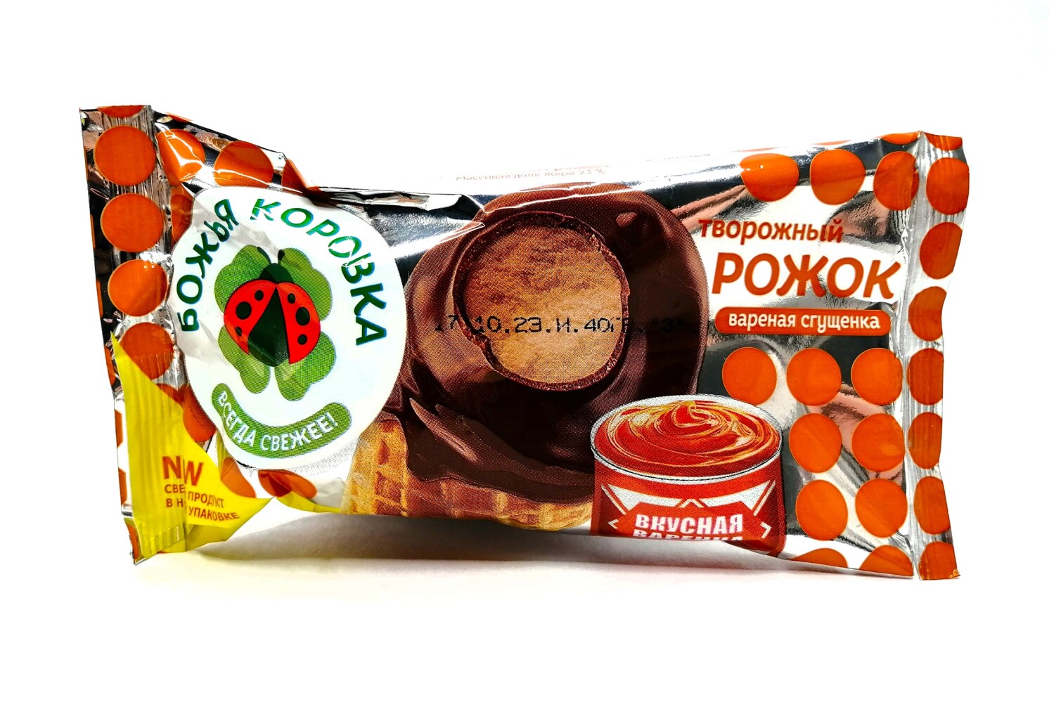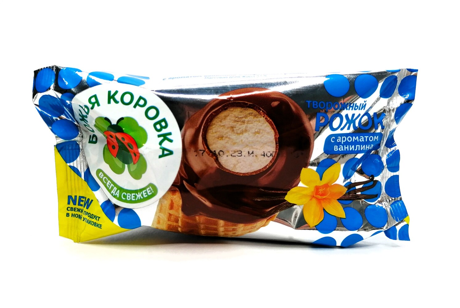 Сырок творожный глазированный кондитерской глазурью с ароматом ванилина в вафельном рожке, массовая доля жира 23%. Состав: творог (молоко сухое обезжиренное, вода, молокосвертывающий ферментный препарат жифотного происхождения, закваска), вафельный рожок (мука, масло кокосовое, сахар-песок, молоко сухое обезжир., соль, вода, Е322), глазурь кондитерская (сахар, заменитель какао-масло лауринового типа(пальмоядровый стеарин), масло кокосовое, какао порошок, Е322, ароматизатор),сахар-песок, масло сливочное, (сахар-песок, сухое обезжир. молоко, сыворотка молочная, зам. молоч. жира (пальмовое, раст., подсолнечное, рапсовое масла)), агар,карамельный колер, ксантановая камедь, дикрахмалфосфат, сорбат калия, ванилин.