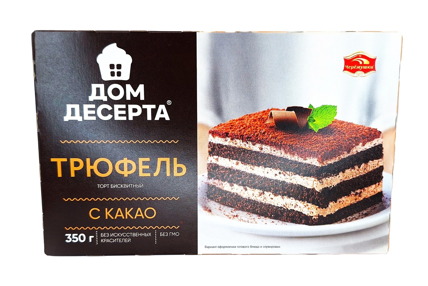 Торт бисквитный Трюфель. Изделие мучное кондитерское. Состав: масла растительные,мука пшеничная в/с,сахар,сироп глюкозно-фруктозный,продукты яичные,вода,глицерин,молоко,какао-порошок,спирт этиловый,алюмофосфат натрия кислый,лимонная кислота,гидрокарбоант натрия,карбонат аммония,патока,моно- и диглицериды жирных кислот,лецитины,Е476,сорбитан моностеарат,твин 80,эфиры полиглицерина,Е150d,каротины,уголь растительный,токоферолы.