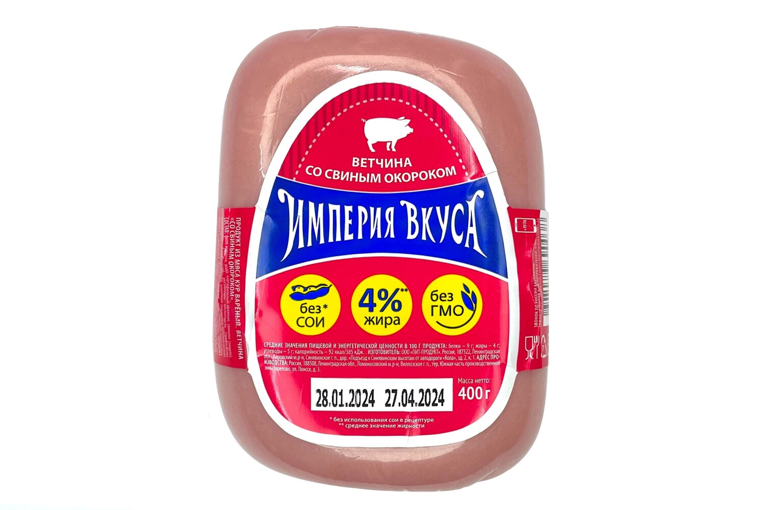Состав: филе куриное, вода, крахмал картофельный, свинина (окорок), каррагинан, трифосфаты, ацетат натрия, животный белок, молочная сыворотка, изоаскорбат натрия, лимонная кислота, соль, говяжий гемоглобин, кармины, нитрит натрия.