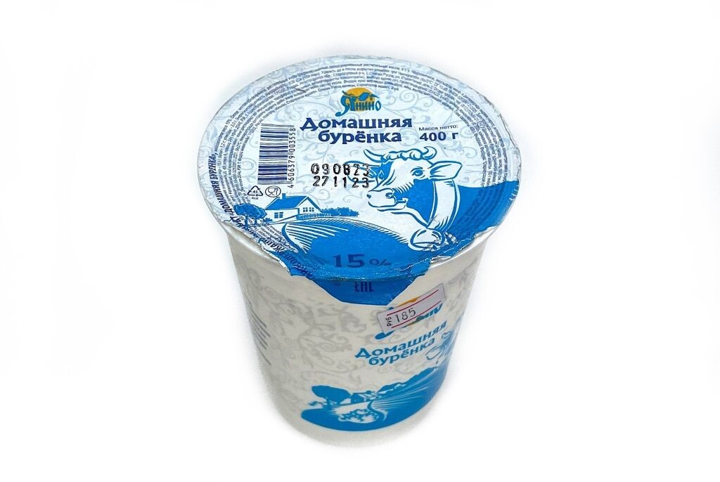 Сметаносодержащий продукт "Домашняя буренка". Массовая доля жира 15%. Состав: молоко обезжиренное, растительные масла( жиры) (рафинированные дезодорированные растительные масла, вт.ч. соевое, эмульгатор моно и диглицериды жирных кислот, антиокислитель концентрат смеси токоферолов), молоко сухое обезжиренное, стабилизатор(Е1422, Е440), масло сливочное, сметана, консервант(Е202), закваска для сметаны.Пищевая ценность на 100г продукта: жиры-15г, белки -1,2г, углеводы-3г, Энергетическая ценность/калорийность на 100г: 636кДж/152ккал