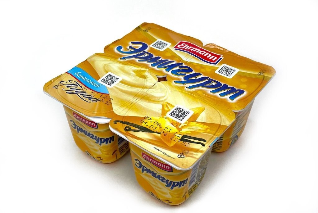 Пудинг молочный ультрапастеризованный "Ванильный" "Эрмигут", массовая доля жира 3%. Состав: обезжиренное молоко, сахар, сливки, стабилизаторы( Е1442, Е1422, каррагинан, полифосфат натрия), сухая молочная сыворотка, вода, ароматизаторы, краситель- каротины, регулятор кислотности-фосфоты натрия. Пищевая ценность на 100 г продукта (средние значения): жиры-3,0г; белки -2,7г, углеводы-17,0г. Энергетическая ценность (калорийность) - 440кДж/110ккал.