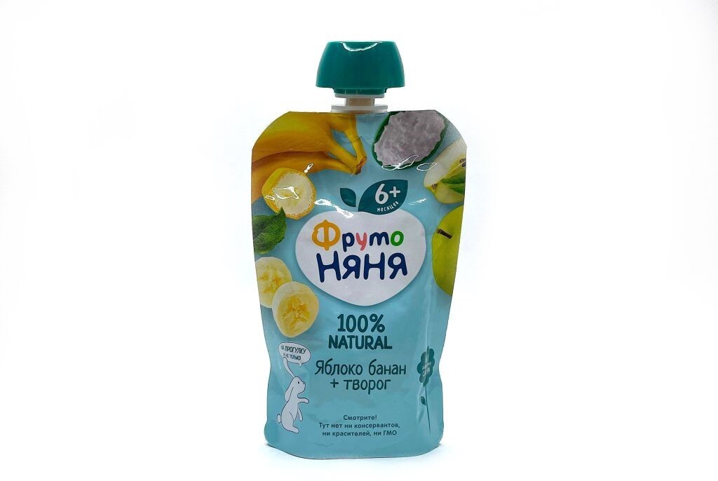 Состав: пюре из яблок, пюре из бананов, творог, сок яблочный концентрированный. Без сахара.