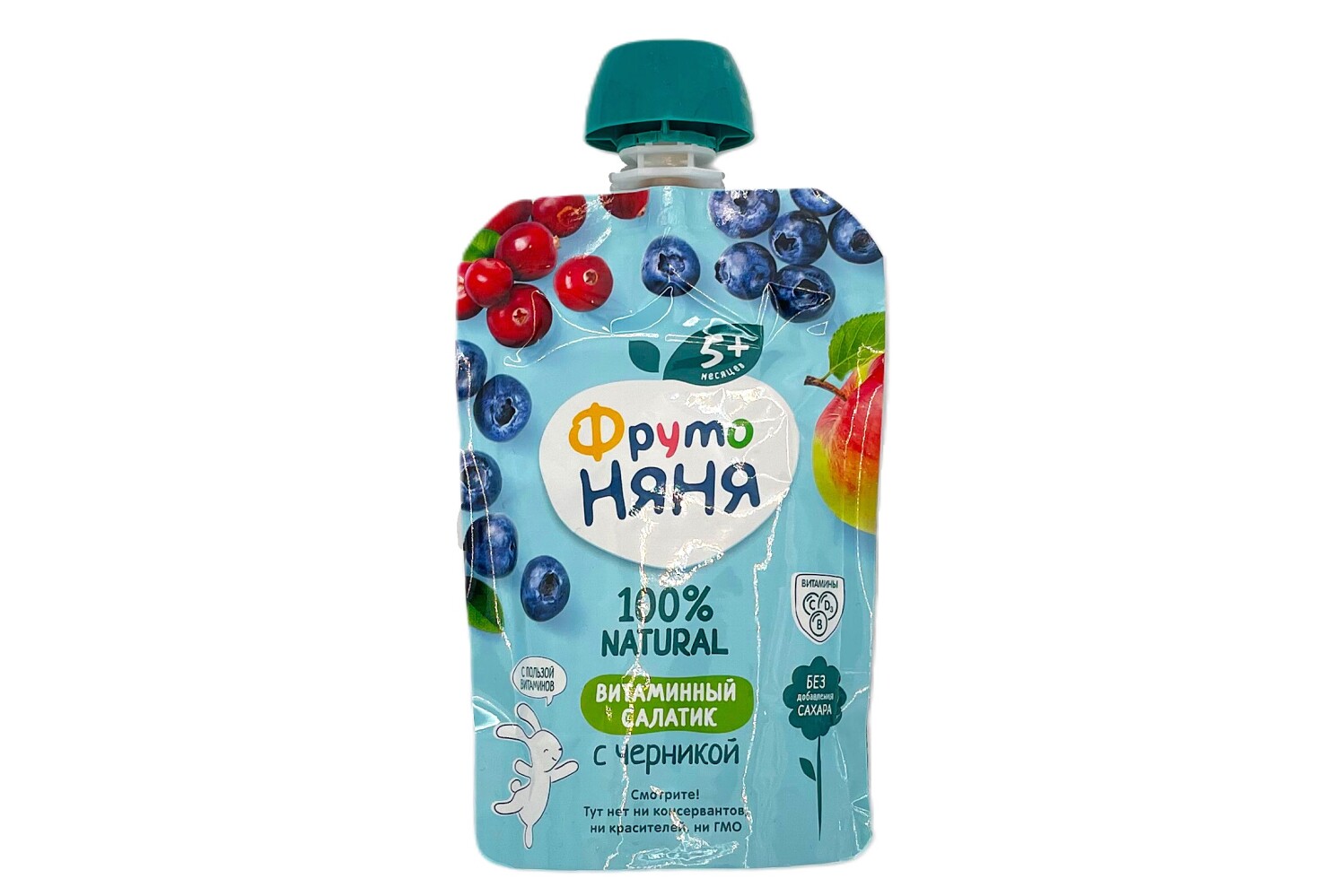 Пюре из яблок, черники, клюквы и брусники, обогащенное витаминами "Витаминный салатик" для питания детей раннего возраста с 5 месяцев, пастеризованное, стерилизованное.