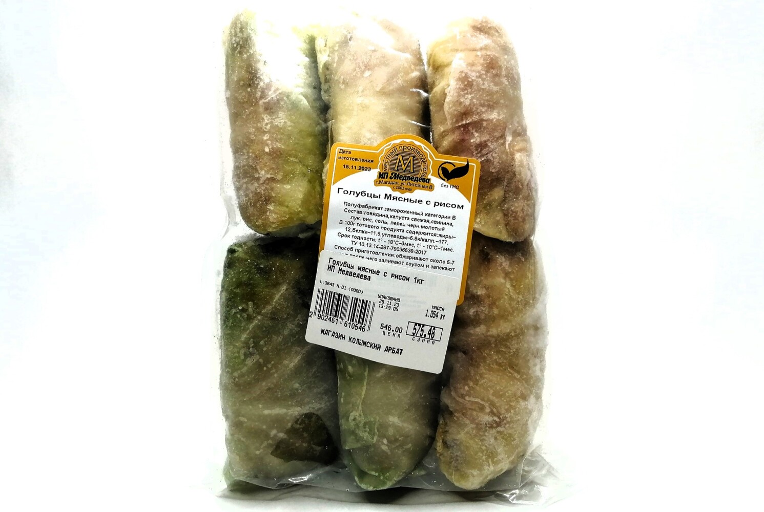 Голубцы мясные с рисом. Полуфабрикат замороженный категории В. Состав: говядина, капуста свежая, свинина, лук, рис, соль, перец черн. молотый. Пищевая ценность (средние значения) 100г продукта: белки - 11,8г, жиры - 12,0г, углеводы- 5,8г.