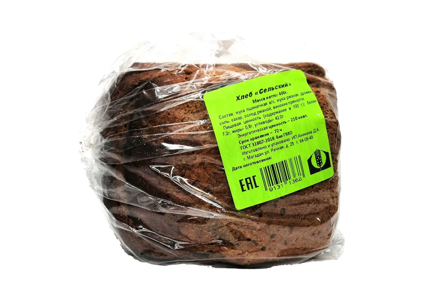 Хлеб "Сельский". Состав: мука пшеничная в/с, соль, сахар, дрожжи, солод ржаной, венские пряности. Пищевая ценность( средние значения) в 100гр продукта: белок-7,2г, жиры-0,8г, углеводы-42г. Энергетическая ценность- 210ккал