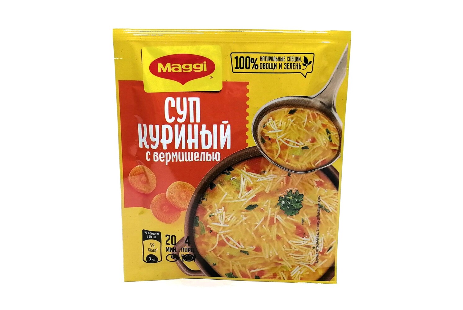 Суп сухой куриный с вермишелью. Состав: соль йодированная( соль, йодат калия), макаронные изделия( мука пшеничная( содержит глютен), вода), сахар, овощи сушеные (морковь, чеснок), куриные нгридиенты( куриный жир, порошок сушеный куриный), зелень сушеная и специи молотые (петрушка, куркума,перец черный),ароматизаторы натуральные, лимонная кислота, кукурузный соус( крахмал кукурузный, соль). Пищевая ценность 100гр продукта: белки - 7,7г, жиры - 2,8г, углеводы - 60г. Энергетическая ценность 100гр продукта - 1314кДж/310ккал.