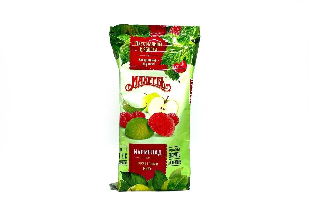Мармелад желейный "Фруктовый микс" Махеевъ. Состав: сахар, патока, вода питьевая, агент желирующий пектины, регулятор кислотности лимонная кислота, ароматизаторы, концентрированный морковный сок,краситель медные комплексы хролофиллинов, экстракт малины, экстракт яблока. Энергетическая ценность 100г продукта-1360кДж/320ккал. Пищевая ценность ( средние значения) 100г: жиры-0,1г,углеводы -80г