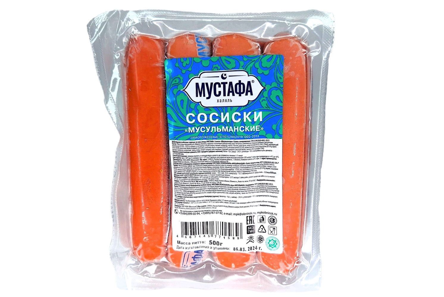 Изделия колбасные вареные из мяса птицы. Сосиски "Мусульманские" замороженные. Состав: мясо птицы(Халяль), мука рисовая, крахмал картофельный, вода питьевая, соевый белок, крупа манная , соль пищевая, соль, регуляторы кислотности ( пирофосфаты, трифосфаты), перец черный, кориандр, экстракт муксатного ореха, чеснок), декстроза, природные загустители( каррагинан, гуаровая камедь), натриевая соль, желирующий агент хлорид кальция, животные белки( говяжий, яичный), усилитель вкуса и аромата( глутамат натрия), антиокислитель изоаскорбат натрия, ароматизатор"мясо", краситель ферментированный рис. Пищевая ценность в 100г продукта ( средние значения ): белки-9г, жиры-17,5г, углеводы-4г, Энергетическая ценность (калорийность) в 100г продукта: 879кДж/210ккал