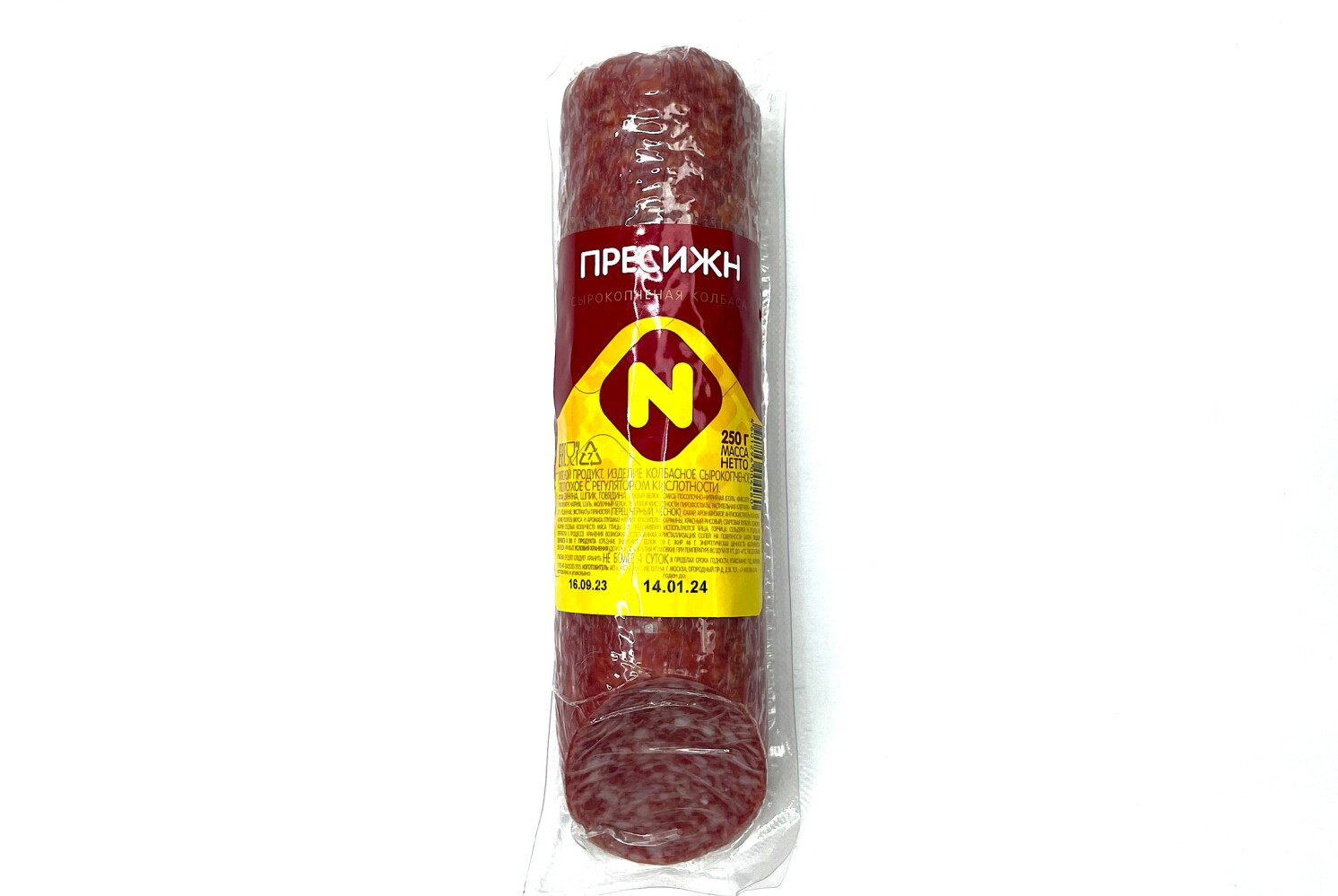 Состав: Свинина, шпик, соевый белок, комплексные пищевые добавки (смесь посолочно-нитритная (соль, фиксатор окраски Е250), регулятор кислотности (Е575, сахара, экстракты пряностей, усилитель вкуса и аромата Е621, антиокислители: аскорбиновая кислота, изоаскорбат натрия, красители: кармины, Е150С, красный рисовый), соль, стартовая культура.