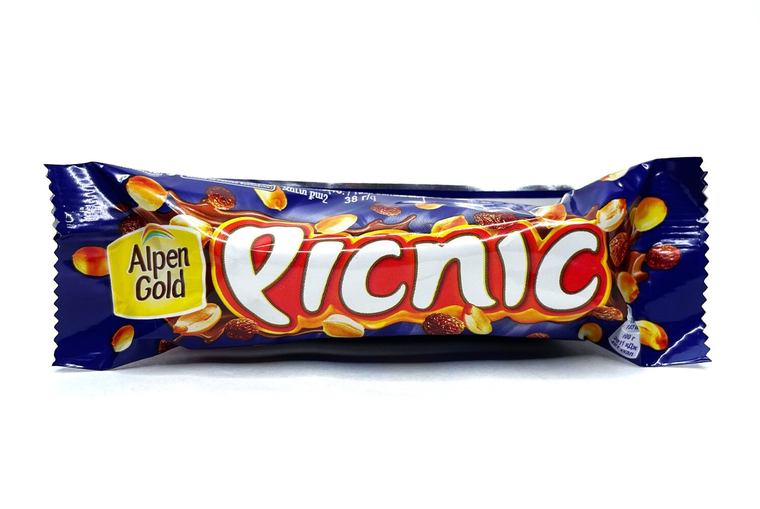 "Батончик "Пикник". Конфета с арахисом и изюмом, начинкой из мягкой карамели, вафель и воздушного риса, покрытая молочным шоколадом.