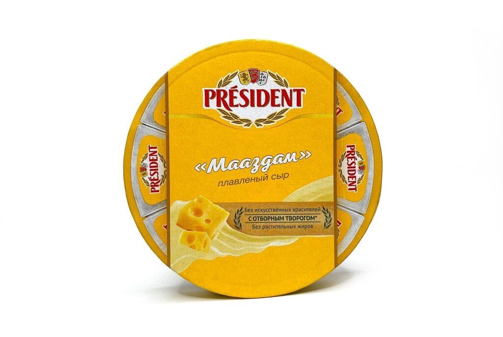 Сыр плавленный " Мааздам" Президент. Массовая доля жира в сухом веществе 45%. Состав: сыры, в т.ч. сыр "Маасдам", молочный белок, творог, эмульгаторы полифосфаты, пирофосфаты, цитрат натрия и фосфаты натрия,вода питьевая, масло сливочное, сухое обезжиреннное молоко, загустители Е1422 и каррагинан, сыворотка молочная сухая, регулятор кислотности лимонная кислота, соль, ароматизатор натуральный, стабилизатор ксантановая камедь. Пищевая ценность на 100г продукта: жиры-17г, белки -7,8г, углеводы-5г. Энергетическая ценность/калорийность на 100г: 854кДж/204ккал