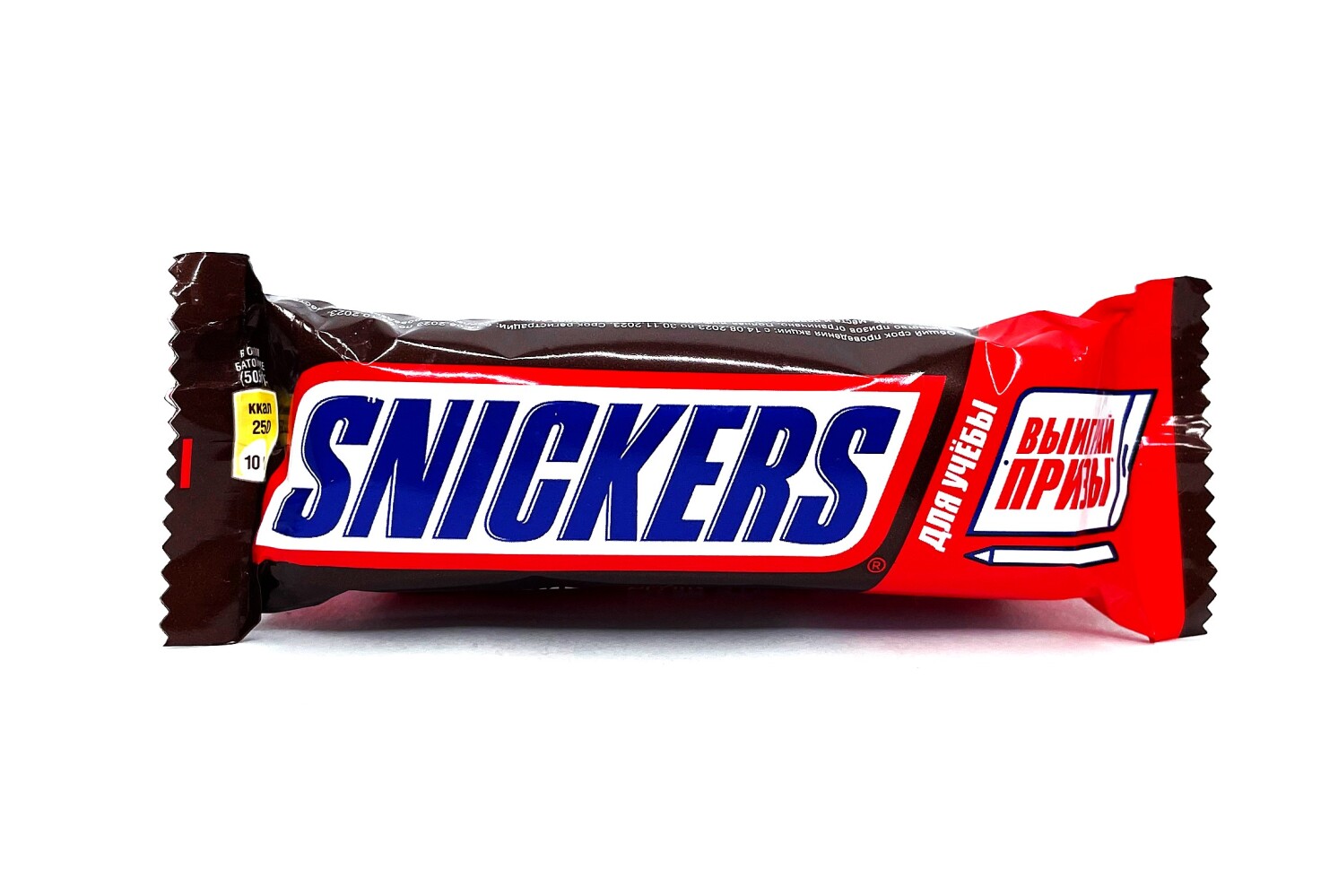 Шоколадный батончик Сникерс с жаренным арахисом, карамелью и нугой, покрытый молочным шоколадом.